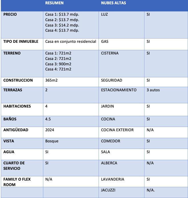 Casa con cuarto de servicio, lavandería, cocina con isla, cisterna, jardín, 2 chimeneas, 2 terrazas techadas, jacuzzi, comedor interior y exterior, asador, cava, T.V. Room, bodega, estacionamiento para 4 autos, contacto para auto Tesla y se paga un mantenimiento de condominio de $10,000 mxn mesuales que incluye seguridad, áreas comunes, alberca compartida y tombling.